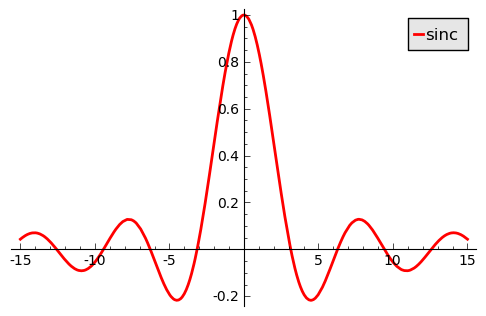 sage: plot(f, x, xmin=-15, xmax = 15, thickness=2, color="red", legend_label="sinc")