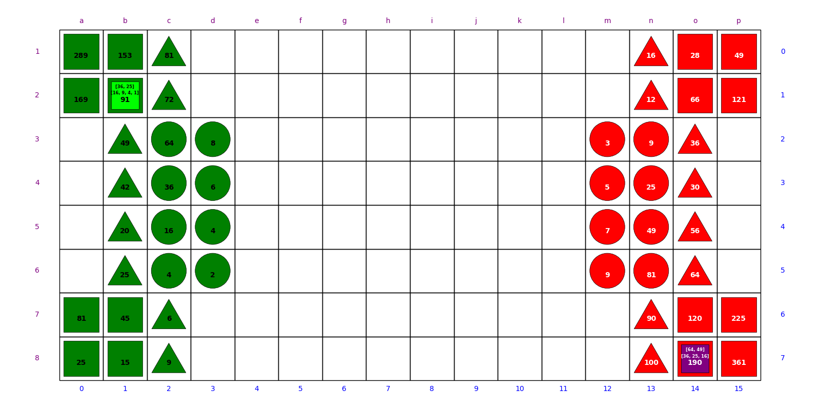 The rithmomachia game board with all subpiece values displayed with the pyramid piece total value.