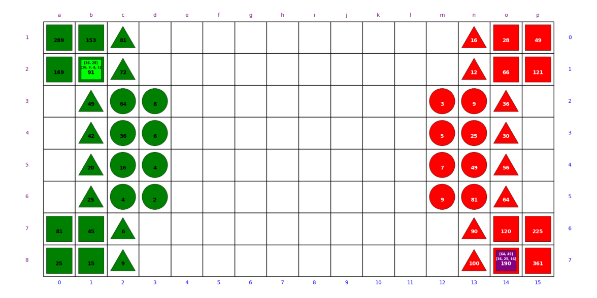This was programmed in sagemath and matplotlib. It functions within an interactive python/sagemath session where you can play a (slow) game of rithmomachia with the computer. More on this later.