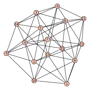sage: Gamma.spectrum() [6, 2, 2, 2, 2, 2, 2, -2, -2, -2, -2, -2, -2, -2, -2, -2] sage: [walsh_transform(f, a) for a in V] [4, 4, 4, -4, 4, 4, 4, -4, 4, 4, 4, -4, -4, -4, -4, 4] sage: Omega_f = [v for v in V if f(v)==1] sage: len(Omega_f) 6 sage: Gamma.is_bipartite() False sage: Gamma.is_hamiltonian() True sage: Gamma.is_planar() False sage: Gamma.is_regular() True sage: Gamma.is_eulerian() True sage: Gamma.is_connected() True sage: Gamma.is_triangle_free() False sage: Gamma.diameter() 2 sage: Gamma.degree_sequence() [6, 6, 6, 6, 6, 6, 6, 6, 6, 6, 6, 6, 6, 6, 6, 6] sage: show(Gamma) # bent-fcns-cayley-graphs1.png
